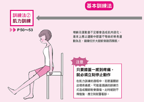 做完伸展操后,就可以进展到锻炼大腿肌肉的「肌力训练」了。 施行肌力训练能帮助膝关节的活动更加稳定,减轻膝盖的负担,缓和膝盖的痛楚。