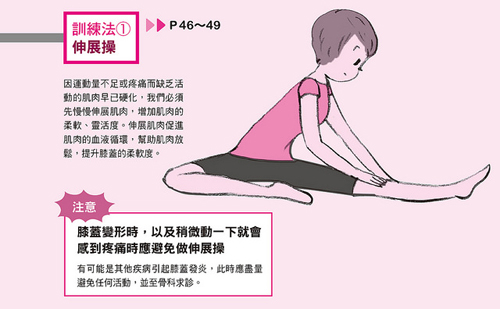 早晚各做1次伸展操及肌肉训练,锻炼大腿的肌肉。