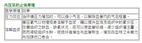 目前在医疗用途上的高压氧,乃是将病患放置于一个完全密闭的压力舱内,接着以空气或氧气将舱压加大到超过一个大气压力以上(通常为大于1.4绝对大气压),接着病患再经由面罩或头罩开始呼吸百分之百的纯氧。 而患者置身于在高压氧舱内,人体可以快速提高体内的含氧浓度并促进新陈代谢,使缺氧的组织活化起来,所以能加速伤口的愈合。 同时,高压氧也具有抑制细菌生长、杀死细菌、排除体内毒素的作用。 换句话说,高压氧治疗的医学原理,就是改善血管收缩,进而缓解疼痛。