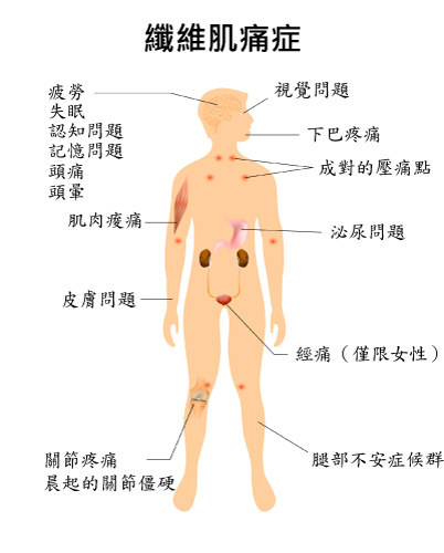 纤维肌痛症的的主要症状为慢性广泛疼痛和压痛,初期多以疼痛、酸痛、疲劳表现,因患者疼痛处外观没有明显的病理改变,常被误认为生活过度疲劳所引起。 而纤维肌痛症发生的确切原因目前还不清楚,普遍认为可能与神经系统失调有关,在正常情况下,因外力或温度的刺激透过神经传导物质上传到大脑,进而产生疼痛感。 由于这些传导物质的失衡,导致神经系统过度放电,使得痛觉被异常放大,让纤维肌痛症患者痛不欲生,却又找不到原因。 此外像是家族遗传、睡眠障碍、身体与心理压力等因素,也可能增加纤维肌痛症发生。