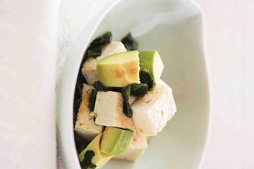 2 豆腐以餐巾纸包裹放入微波炉加热,沥干水分后切为一口大小备用。