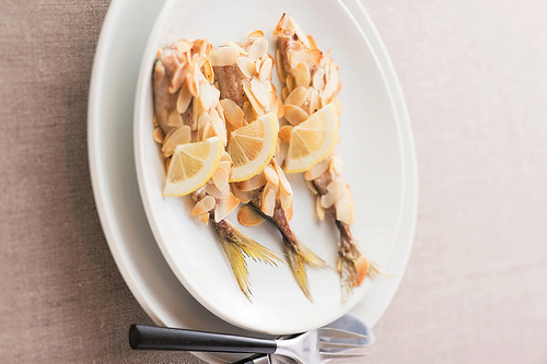 1 竹筴鱼切为方便实用的大小,并洒上白葡萄酒,静置一段时间以去除腥味。 之后擦干多余水分并以盐巴、胡椒调味, 最后依序裹上面粉、蛋白、扁桃仁片。