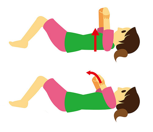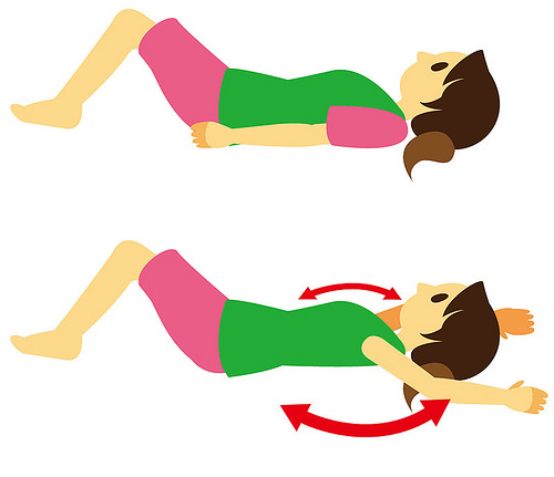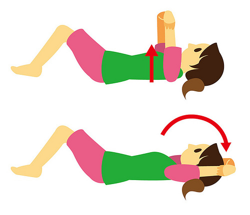 1.躺下,将浴巾折成1/4大小卷起,垫在肩胛骨中间〈与脊椎重迭〉。