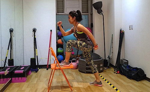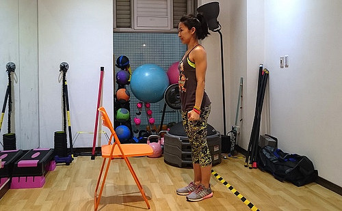 -用来运动的椅子,材质要够稳固,不只耐重,四个角更要平稳!运动过程中都请让椅子靠墙增加稳定,若地板很滑导致椅子容易被推动,请在椅子下面垫运动地垫,同样垫上后请测试稳定度!椅子的高度不要超过膝盖,若高于膝盖会增加困难度与关节压力!我拿来示范的椅子其实不太适合初学者在家做,容易倒,不要学我买这个!