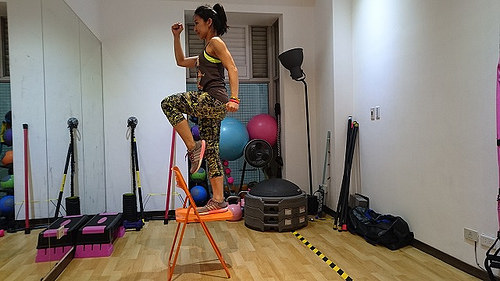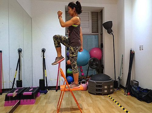 -单脚整个脚掌踩到椅子上,往上站起,将另一脚的膝盖抬高,同时摆动双手,不要同手同脚。