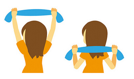 2将握住毛巾的双手高举,再弯曲手肘使双手下降,毛巾位置也下降到背后。