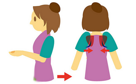 身体直立,双手交握在背后,两只手无法上举超过腰骨的位置