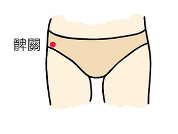 髀关穴位在腰骨突起处、正下方肌肉稍微凹陷的地方(阔筋膜张肌与股直肌之间),若是这两条肌肉力量低下,将导致骨盆前倒,造成腰痛。 可侧躺于地面,在髀关穴的位置放一颗网球,搭配深呼吸,利用体重的重量按摩。