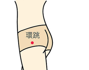 环跳穴位在大腿根部、外侧骨头隆起与臀外上1/4中点的地方。 这个穴道恰巧位在构成臀部主要肌肉的大臀肌上,长时间久坐,没有充分利用大臀肌,将导致肌力低下,肌肉紧缩,柔软性变差。 藉由按摩环跳穴,就可以缓解僵硬的大臀肌,