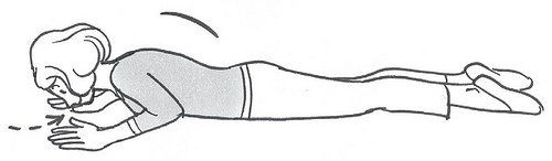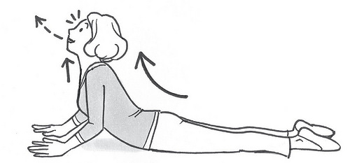 (1)趴姿,再抬起上半身同时吐气。 请将眼睛睁大,下巴往上抬(伸展喉咙),维持此姿势 10 秒。