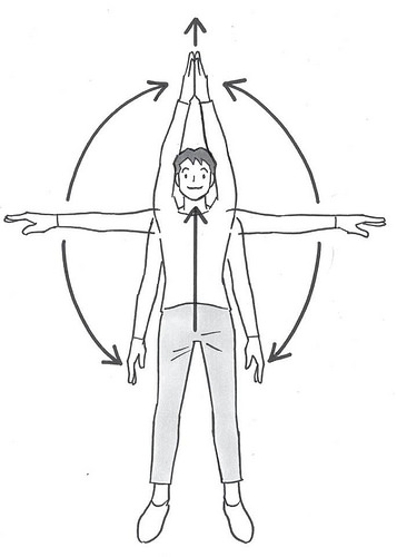 3.吐气并慢慢将双手放下至身体两侧。 请重复双手举高、放下的动作,共3次。