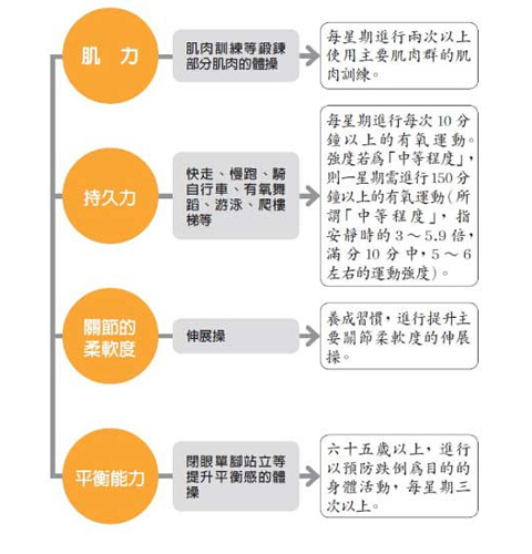 要打造到老都能灵活不卧病的身体,肌力、持久力、关节柔软度、平衡能力,缺一不可: