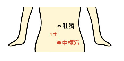 刺激穴道法:躺下,双手食指重迭,5秒渐渐加力按压后,5秒维持同一力道按压,最后5秒渐渐放开,或用暖暖包热敷。 此外也可用吹风机,在身体不感觉烫的程度下,像画圆圈般,吹中极穴1~2分钟。