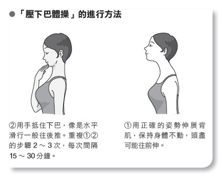 如上图,头和背部肌肉保持直立姿势,手指抵着下巴顶端,反复进行后压和回复原状两步骤。 重点是往后压时,要想象头部水平滑行移动。