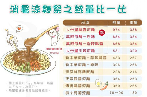 依照图上的凉面热量排行榜看来,不难发现各大超商主打的「半台斤」、「大份量」凉面通通上荣登前几名啰!