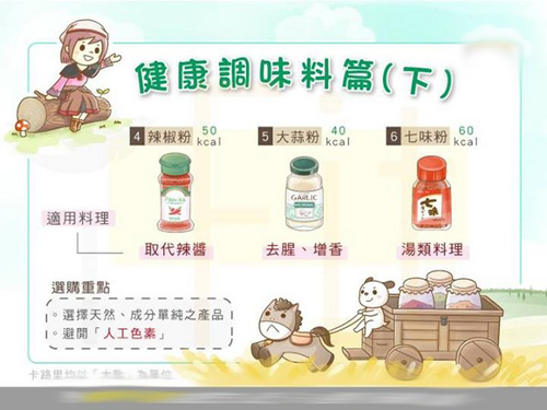 市售辣椒酱、辣油多半添加了大量的盐、香料来增味,每大匙热量高达70 kcal,钠含量更是惊人,建议改选由干辣椒磨粉制成的辣椒粉 。 以同量的辣椒粉为例,每大匙为50 kcal,热量相对较低,辛辣香气令人食指大动。 嗜吃辣油的团员,建议以干辣椒加白醋的方式取代辣油、辣椒酱等加工调味料,不仅可减少盐分摄取,也能兼顾美味唷!