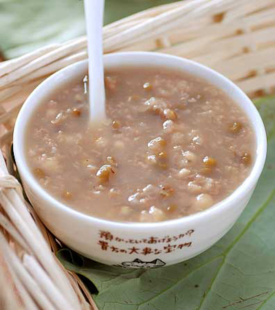 制作方法:把绿豆、薏苡仁、大米洗净,煮粥,待熟后再加入冰糖,拌匀即可食用。