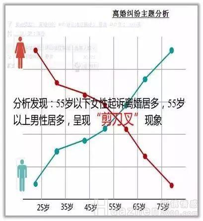 司法互联网大数据也显示出信息:离婚高峰在婚后2-6年。在25岁之前明确提出离婚的人中,女性占大多数。30岁以后,男人和女人逐渐接近,而当他们到了55岁,男人就更常见了,呈现出“剪刀差”。