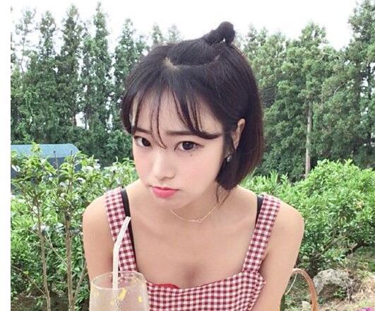 年轻妹子一定不要错过这一款夏季短发,黑色短发配上空气刘海是真心甜美减龄,并在头顶上扎个小马尾,特别俏皮可爱。