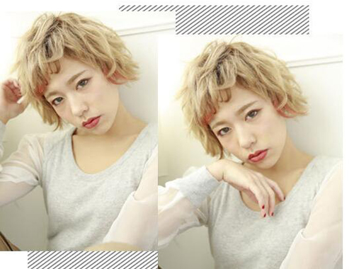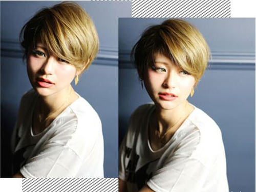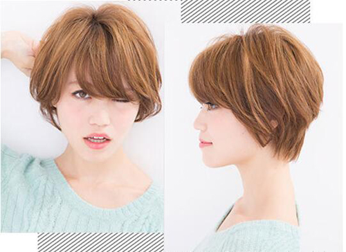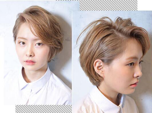 这款适合小圆脸、瓜子脸的mm,二八分的刘海更加凸显mm挺翘的鼻子和清秀五官,露出双耳清爽可爱,加上金色染发更显时尚帅气。
