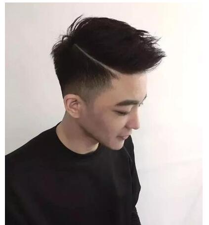 今年很流行雕刻发型,这款在发丝的分界线处做了剃线的设计,也是比较流行的一种发型,发顶部分的发丝向上梳理,耳朵上方发丝做成渐变的修剪,很阳光有男人味的造型。