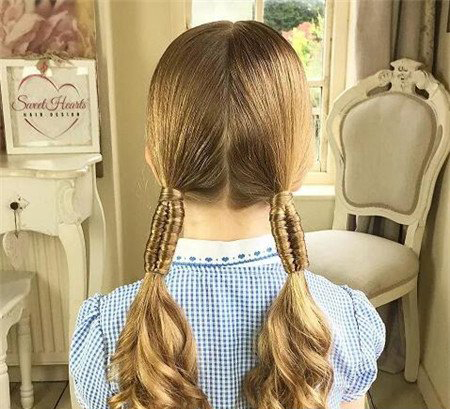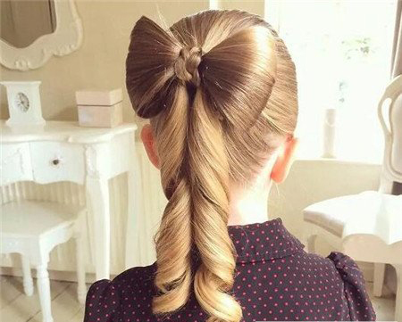 有时候时间比较匆忙,可以给女儿打造这款甜美的蝴蝶结发型,搭配螺旋卷线条,气质大方。