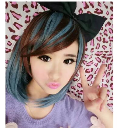 很可爱的一款原宿风短发发型,及肩的发丝,发尾挑染成蓝色,斜刘海中也挑染了几缕蓝色发丝,很个性很甜美。