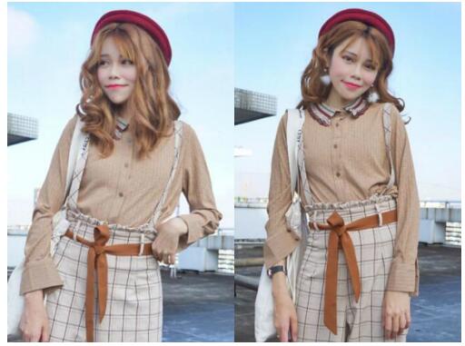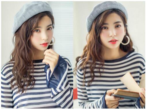 将中长的头发染成棕黄色,显得时尚又新潮,加上蛋卷发设计,头发变得蓬松感十足,三七分的斜刘海稍微遮住一小部分额角,对修饰脸型起到不错的作用,搭配一顶贝雷帽,日系女生软萌的风格立显。