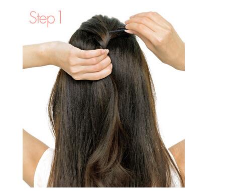 第一步:先用梳子将长头发梳理通顺,然后将前面刘海和部分长发向后,并进行扭转,然后黑色小发夹固定好。
