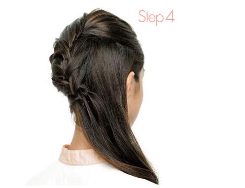 第三步:然后以简单三股麻花辫将头发再往下面编一点,发尾用橡皮筋固定一下,然后用黑色小发夹将发辫固定在脑后。