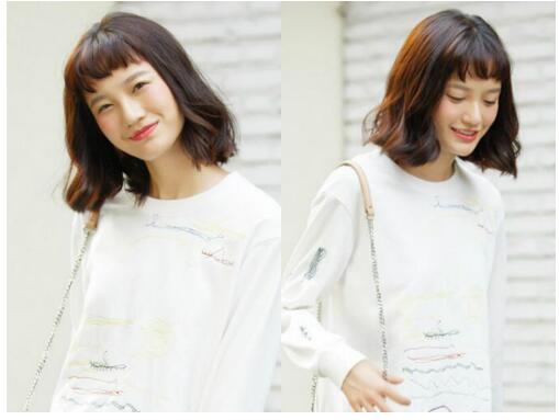 对于想剪波波头发型可是又有脸短、额头窄或发际线低等问题的妹子们,小编建议你尝试留一个二次元短刘海!二次元短刘海的修剪使整个发型变得生趣十足,短至眉毛上方使一部分额头露出来,无形中就拉长了脸型也遮挡了窄额头和低发际线,把波波头的发尾加入卷烫设计可以使发丝变得蓬松很多,垂在脸颊两边也就能遮挡两腮了,是不是很神奇呢?