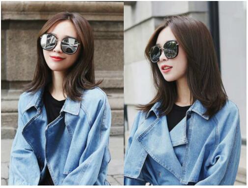 中分刘海对于想显脸小的妹子来说也是个不错的选择,中分刘海的设计可以使发丝遮住两腮,不经意就制造出瘦脸效果。发尾选择与内卷反其道而行的外翘设计则更具有俏皮感,再戴上一副大墨镜遮住大部分脸,任谁也看不出妹子的脸型是大还是小吧!