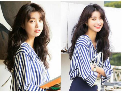 披着长卷发的女生通常给人一种温柔甜美的感觉,妹子一头长发卷烫后虽然看似很厚重,却可以把脸蛋衬托得小巧些,刘海也经过卷曲并拨向两边,露出一部分额头拉长脸型之余更突出妹子精致的五官,经典的黑发看起来自然,再露出灿烂的笑容,简直是清纯校花的代表了!