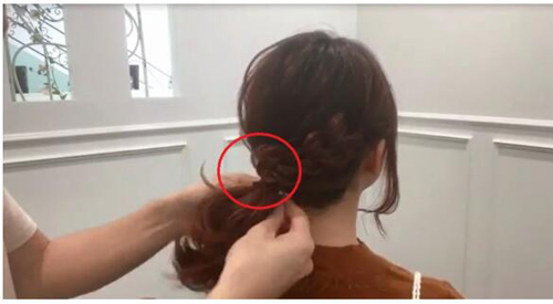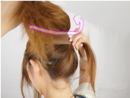 第三步:一手把马尾撩起,一手将侧边小发束从马尾后面绕到橡皮筋下,然后进行缠绕,至发尾用黑色小发夹固定好。