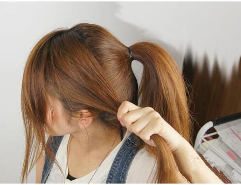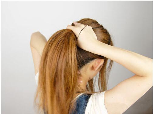 第二步:并橡皮筋将发束扎马尾,再从侧面拿起一束头发。
