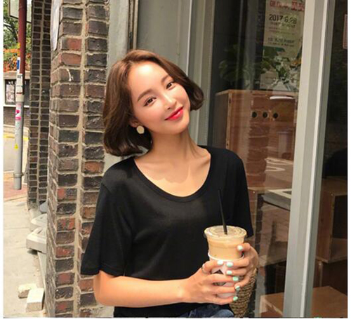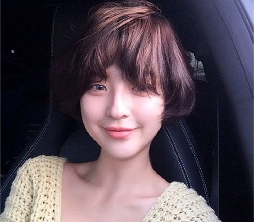 这是圆脸萌妹必备的学生头短发,刘海和发尾都很有空气感,衬得小圆脸更加可爱俏皮,发际线高的妹子也可以试试这款发型。