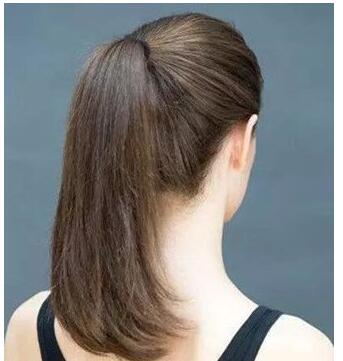 第二步:接着将全部集中到头顶来,然后用橡皮筋扎成一个光洁的高马尾辫。