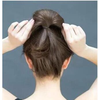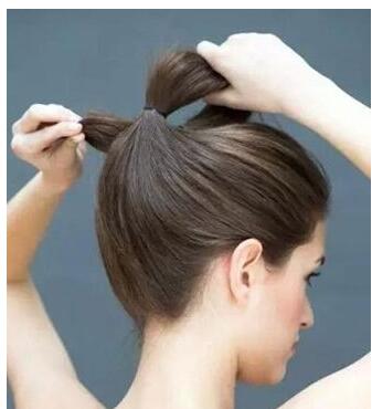 第四步:在马尾辫的扎发处上方掏出来一个洞,将发梢从上往下穿过来,将形成一个丸子形状的下发髻,将发髻向四周拉散开来。