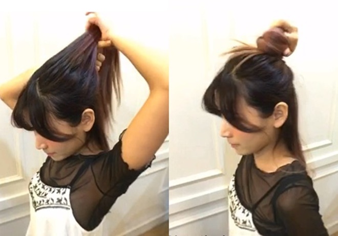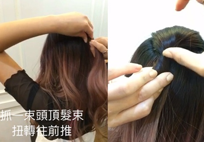 ▲Step 4 抓一束头顶发束,扭转往前推。