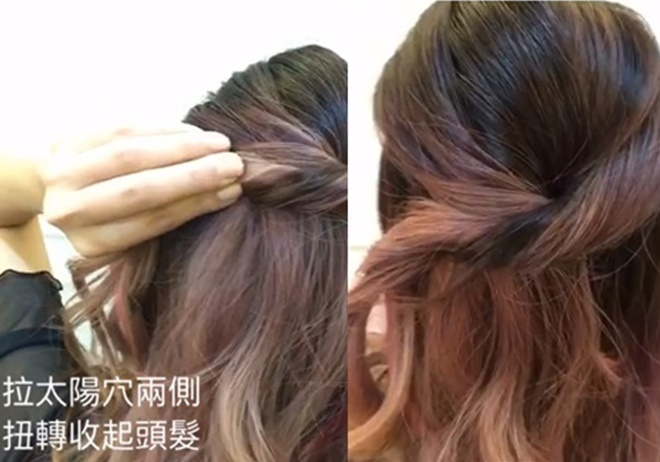 ▲Step 5 拉太阳穴两侧,扭转收起头发。