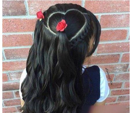 还是女童创新设计的一款马尾辫,心形的马尾扎发很多,怎样做更为独特呢?这款黑色的层次感长卷发在一侧使用发梳的末端分离出心形造型,使用红色的发带做马尾扎发造型,结合上两侧的编发更加唯美。