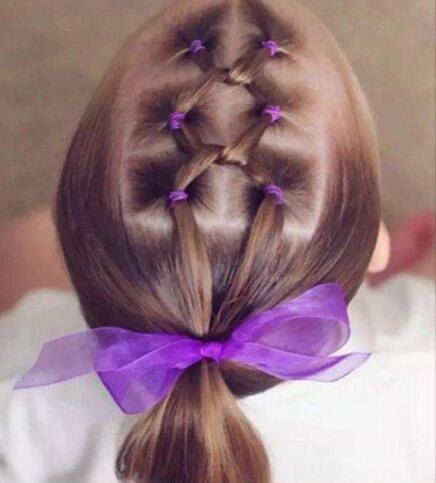 短发的小女孩在扎发过程中很容易有碎发的产生,先将发丝做简单的竹节状扎发在扎成马尾辫就可以避免了,这款从额前中间位置开始做个性的竹节状扎发造型,在马尾辫上搭配紫色的发带更有公主范。