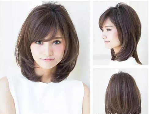 斜刘海搭配两边的头发修饰脸型,发尾头发向中间集中在视觉上有拉长脸型的作用,层次设计不仅时尚有范,还让lob发型发量看起来比较多,所以发量少的妹子也可以尝试这款造型。