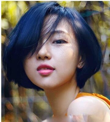 一款气质的内蓬短发发型,不对称的设计显露出别致的妩媚动人气质,加上深蓝色的发色不仅显肤白而且大胆前卫显个性, 新的一年新的时尚。