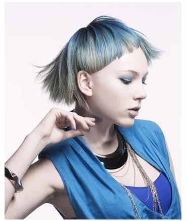 带有个性渲染的短发沙宣发型带有不规则的修剪方法,这款浅亚麻色的直发在发顶采用了浅蓝色的挑染让发型看起来更有层次感,超短的刘海搭配碎发轻舞的直发发丝冷艳时尚。