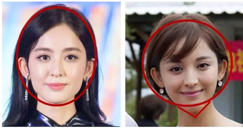 比如说,娜扎的长发和短发,人眼对她脸部的廓形捕捉是不同的,左边这张我们会觉得她的脸是偏方的长圆形,下庭有些沉重,右边就会偏可爱和瓜子一些。这是因为不同的发型轮廓对于面部廓形增加的线条不一样。左边的发型给娜扎增加的是直线,右边增加的是弧线;左边的发型把她的脸拉长,右边是横向拉宽,脸变短,又因为头发的长度刚刚到唇角,所以会反衬得下巴更小。