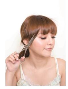 以扁梳将刘海发型梳整齐后,找出自己想要的斜度,剪刀从上往下开始修剪。 不要一开始剪得太多,以免不小心失手就来不及修补了。 接着再用扁梳梳起刘海发型发尾后,如图直立剪刀慢慢地由右至左将发尾剪出小小的锯齿状,使边缘较自然而不厚重。