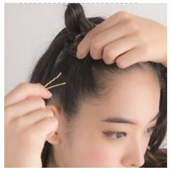 最后步骤用金色小发夹固定好发尾,而右侧的发束也以同样的方法来完成。最后,将准备的发饰戴在右侧小发髻下方,这样就可以完成这一款可爱俏皮的哪吒头扎发。