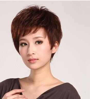 简单的清爽的短发假发造型设计再配合低调的深棕色染发颜色,及耳的短发造型与碎发形式的斜刘海相搭更添女生十足的干练气质风。