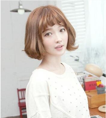 利用的是简单的棕黄色染发设计来衬托女生肤色的白皙感,再配合简单的中短发波波头假发造型设计与短刘海相搭更添十足的可爱甜美风。